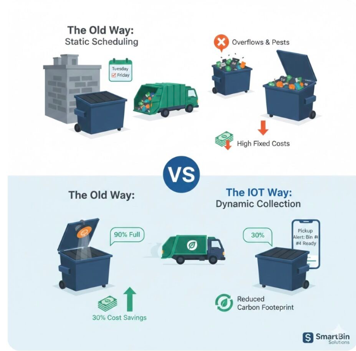 In the world of commercial facility management, «Static Scheduling» is a hidden profit killer. Most trucks arrive on a fixed schedule (every Tuesday and Friday), regardless of whether your bins are overflowing or 70% empty.